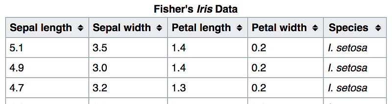 For this example, we use a publicly available multi-variate data set for the identification of three species of the Iris flower based on the length and width of its sepals and petals. The British statistician and biologist Ronald Fisher collected 50 measurements each of the three species of the Iris flower on one fine day in a lush pasture in the Gaspé Peninsula and recorded the measurements of the length and width of the sepals and petals that can be used to identify the exact species of the Iris flower. Here’s a snippet of the dataset for the three species: